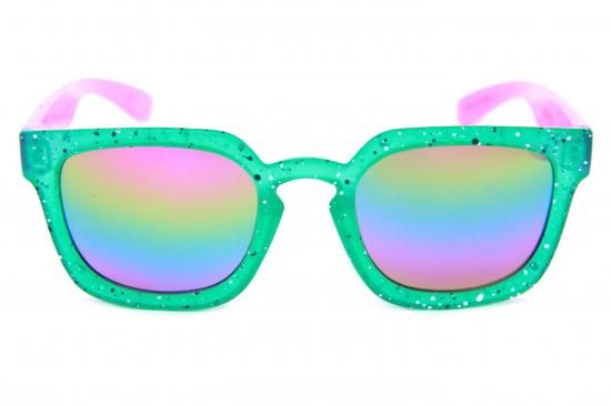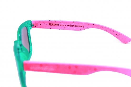 鮮やかなネオンティールのポリカーボネートフレームに、ネオンピンクのアーム、さらにブラックのスプラッターペイントでアクセントをプラス。