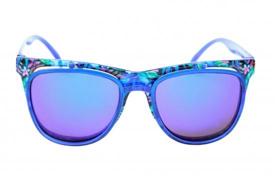 常夏ムード全開のブルートロピカルプリントをまとった、ハッピーでアグレッシブなフリップアップサングラス。