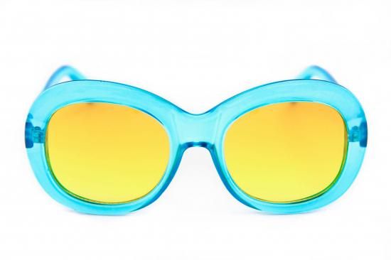 透明感のあるクリスタルブルーのポリカーボネートフレームに、タヒチの朝焼けをイメージしたカラーのレンズを組み合わせた1本。