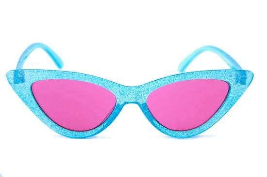 グリッターが煌めく透明感のあるブルーのポリカーボネートフレームが、レトロなキャットアイシェイプを際立たせるSpace NeedleのBlue Glitter。